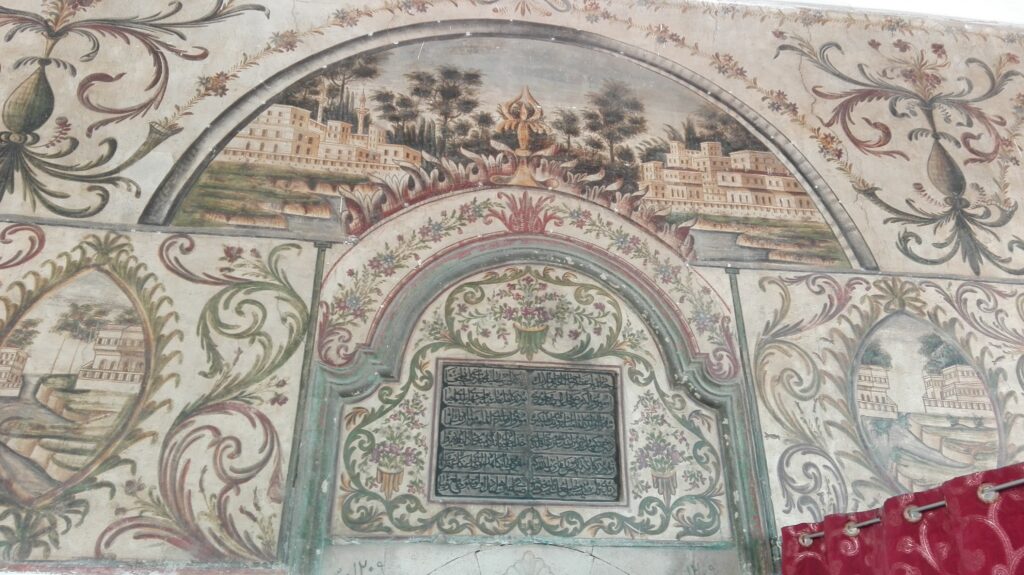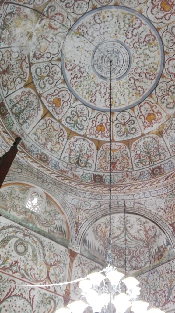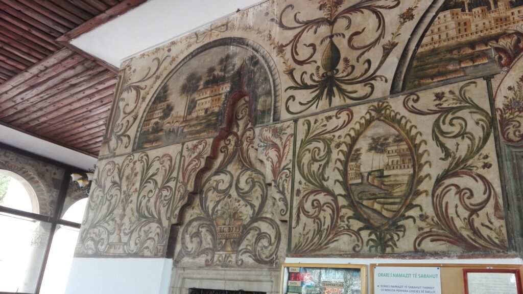 Din piață, pașii ne-au dus firesc spre moscheea Et’hem Bey. Mică, discretă, aproape modestă la exterior, dar cu un interior care te oprește din mers. Este unul dintre puținele lăcașuri de cult din lume unde pereții nu spun doar povești religioase, ci și povești despre țară.