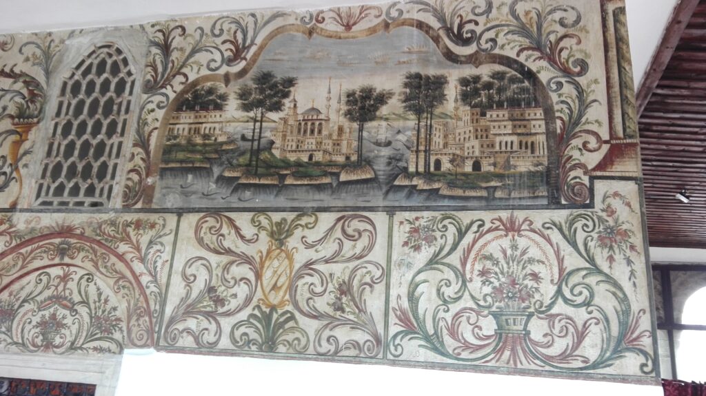 Pe ziduri sunt pictate panorame din Albania: munți, sate, copaci, peisaje care par rupte dintr-un album de călătorie. Intrând acolo, aveai senzația că Albania întreagă a fost strânsă într-o singură încăpere, ca un rezumat vizual al unei țări care și-a purtat identitatea mai mult în tăcere decât în discursuri.