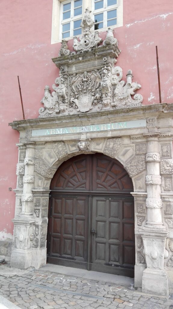 În interiorul muzeului, camerele te poartă prin secole de istorie. Am trecut prin săli decorate în stil baroc și am dat peste costume de epocă, arme și instrumente muzicale. Un colț întreg era dedicat balurilor din secolul al XVIII-lea, cu manechine îmbrăcate în rochii imense și peruci pudrate. Castelul nu e spectaculos prin mărimea lui, ci prin felul în care te face să înțelegi istoria locală. Și mai ales prin atmosfera aceea de „oraș care a scăpat nevătămat”, în care trecutul și prezentul încă se privesc în ochi.