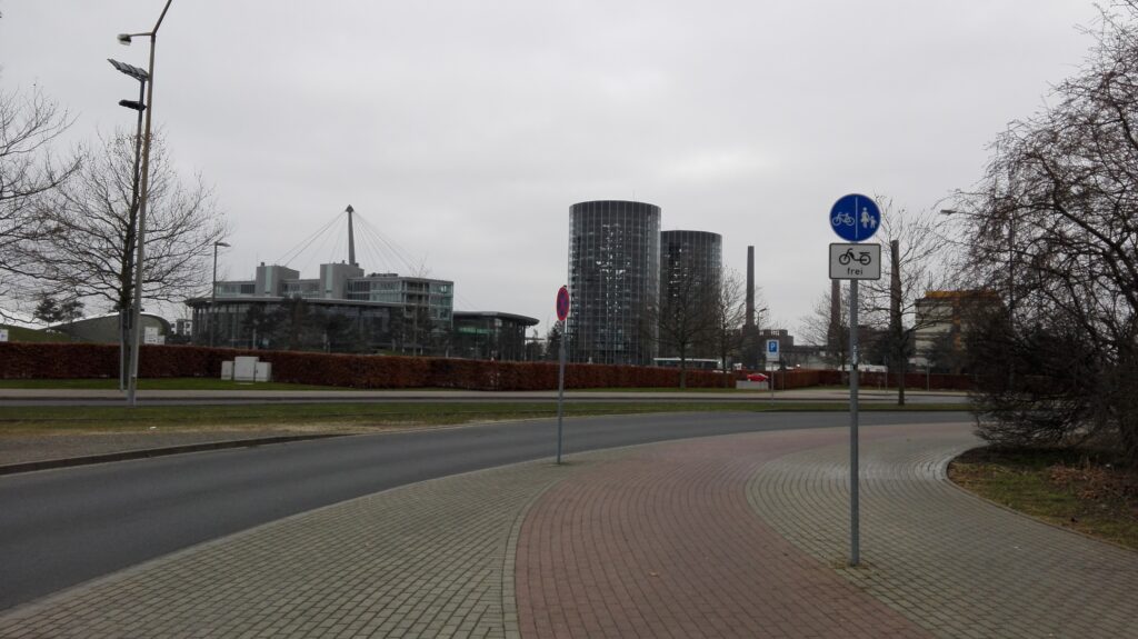 Cu pași grăbiți am pornit spre ceea ce colegii mei așteptau de la început: Autostadt. Numele îi descrie perfect – un „oraș al mașinilor”, ridicat chiar lângă uriașa uzină Volkswagen. De departe se vedeau cele două turnuri de sticlă, niște cilindri imenși în care erau parcate mașinile noi, stivuite ca niște cutii de chibrituri strălucitoare.