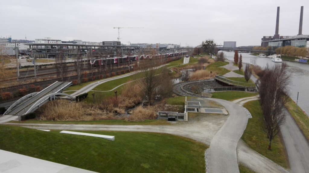 Am făcut câteva fotografii, ne-am oprit pe o bancă să mai bem câteva înghițituri din sticlele de apă (că berea se terminase la pizzerie și am început să ne gândim la pasul următor. Și cum colegii mei nu uitaseră motivul principal al excursiei, era clar unde urma să ajungem: la Autostadt, orașul în oraș dedicat automobilului.